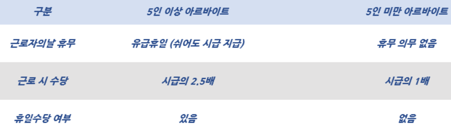 - 5인 미만 사업장 근무자: 유급휴일 의무 없음, 쉴 수는 있지만 수당은 못 받을 수도 있음