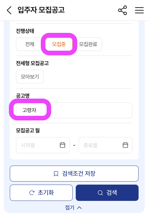 여기서 진행 상태를 "모집중" ,공고명에 (예: 공공실버 또는 고령자)을 선택하면 해당 조건에 맞는 공고만 볼 수 있습니다.
