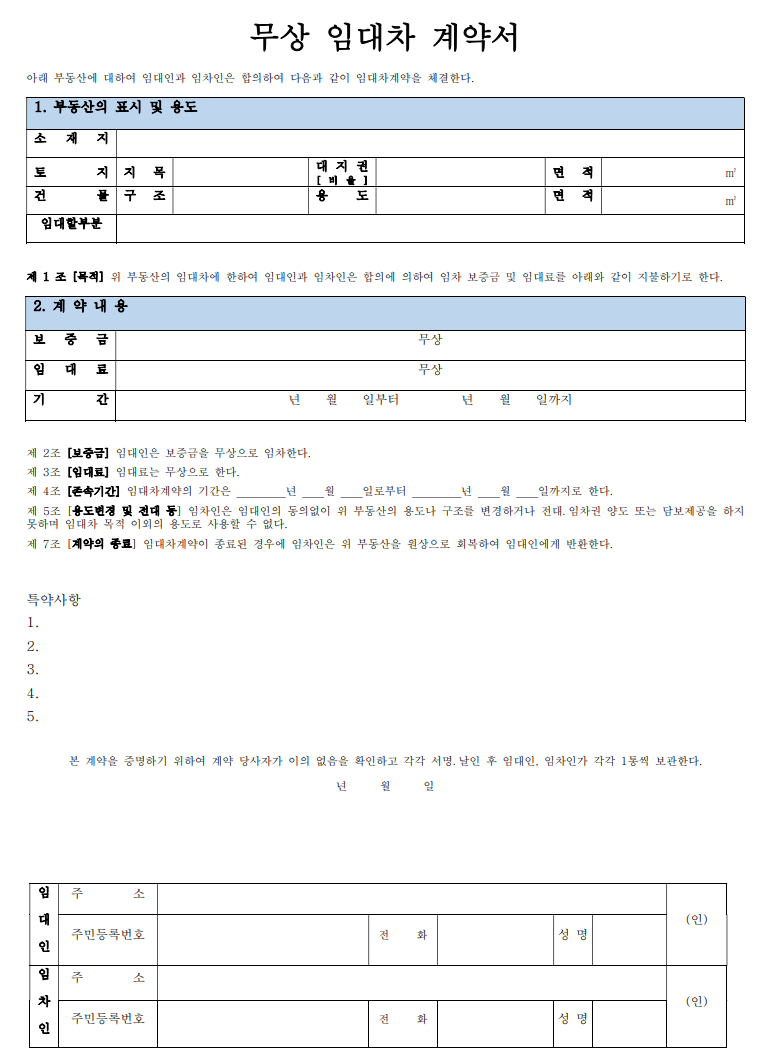 무상임대차계약서 양식 무료 다운로드