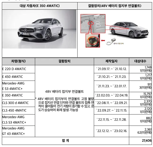 ▶ 리콜 내용: C 300 4 MATIC 등 2개 차종 82대는 12V 및 48V 접지 연결 볼트 조임 불량