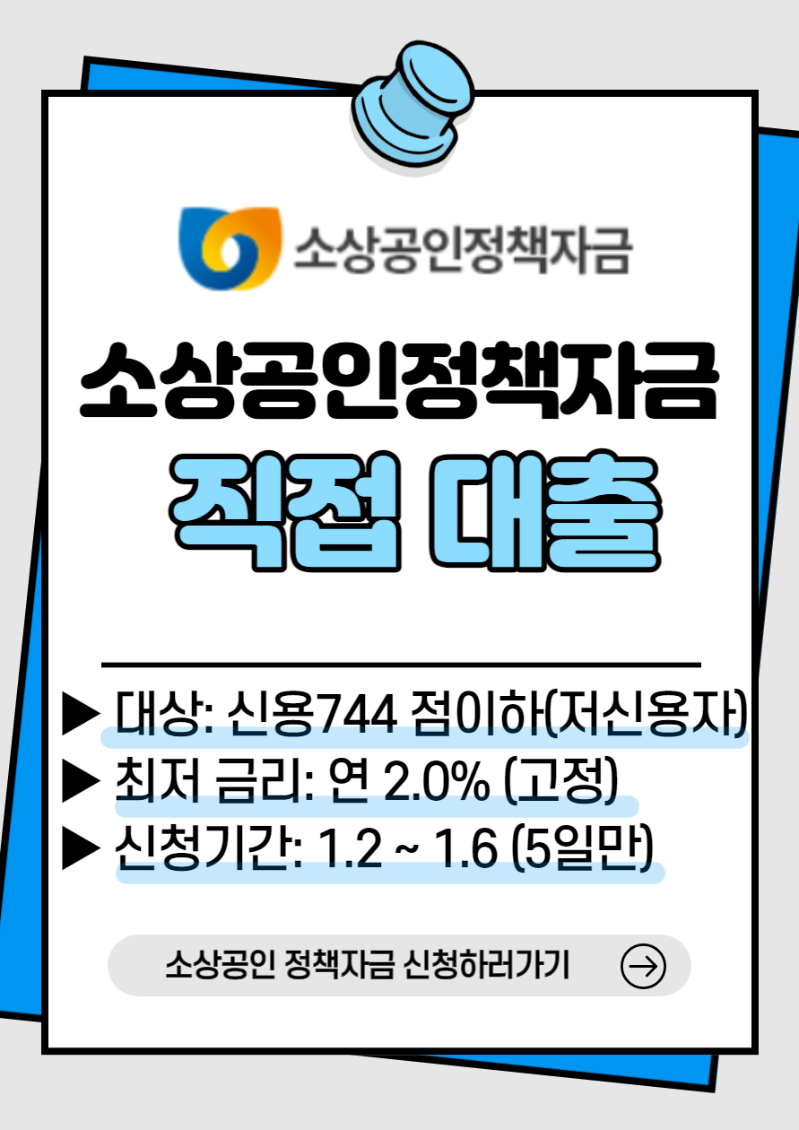 소상공인 분들에게 저리로 돈을 빌려주는 정책자금 직접대출 신청이 2023년 1월 2일부터 6일까지 접수를 받습니다. 신용점수 744점 이하 저신용자도 최대 연 2% 고정 금리로 3천 만원을 빌릴 수 있는 기회를 놓치지 마시고 꼭 받으셔야 합니다.
