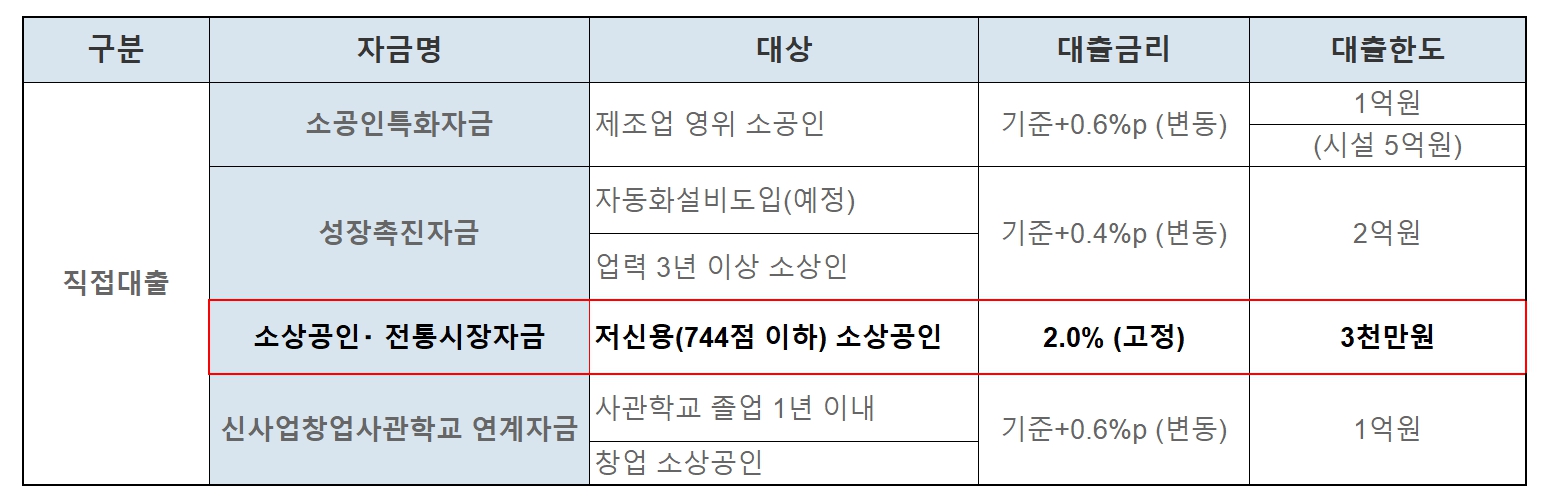 제일 저렴한 대출 금리인 2.0% 로 받을 수 있는 부분은 소상공인 전통시장자금으로써 744점 이하의 저신용 소상공인에게 해당됩니다. 최대 3천 만원을 신용으로 빌려줍니다.