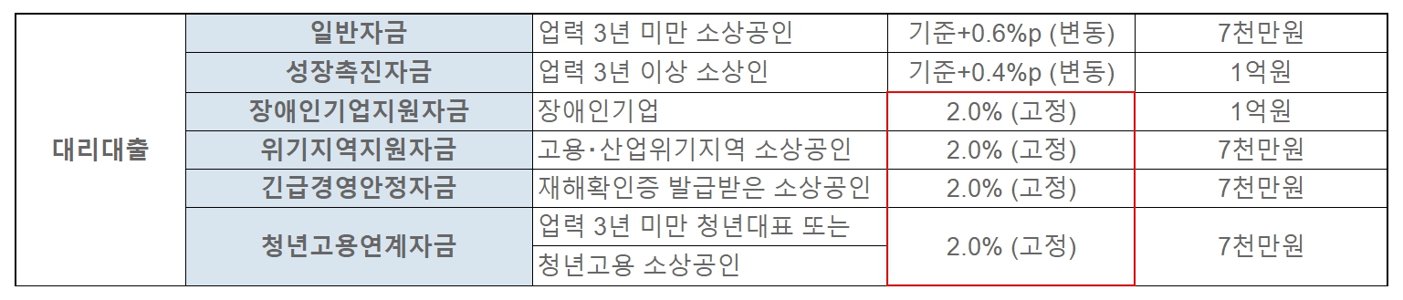 은행을 통해 빌리기 때문에 절차가 복잡하고 늦게 받을 수는 있지만, 빌릴 수 있는 금액이 크고 장애인, 위기지역, 긴급경영안정, 청년고용 관련되어있다면 2.0%의 낮은 고정이율로 융통가능합니다.