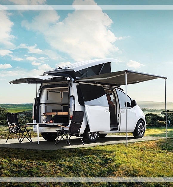 차양막(우측 어닝) 시스템은 공간을 확장해 사용할 수 있고 어닝 내부에 장착한 LED 조명은 야간 편의성을 높여준다. 전동으로 시트 각도 조절이 가능한 2열 풀 플랫 시트를 통해 취침 공간을 만드는 것도 가능합니다.