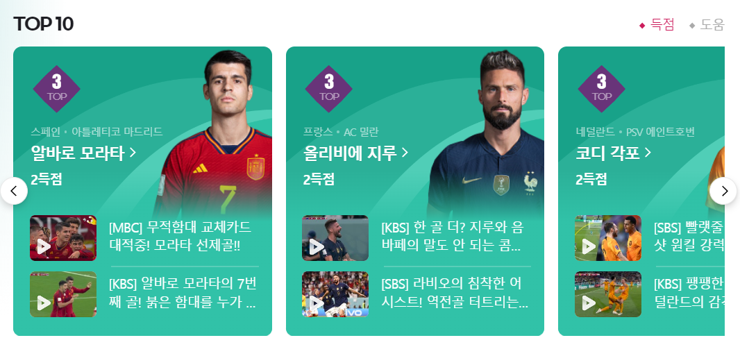 현재 진행된 경기 까지 득정왕이 누구인지 궁금하시죠? 현재까진 3득점을 한 에네르 발렌시아와 킬리안 음바페가 공동 1위입니다.