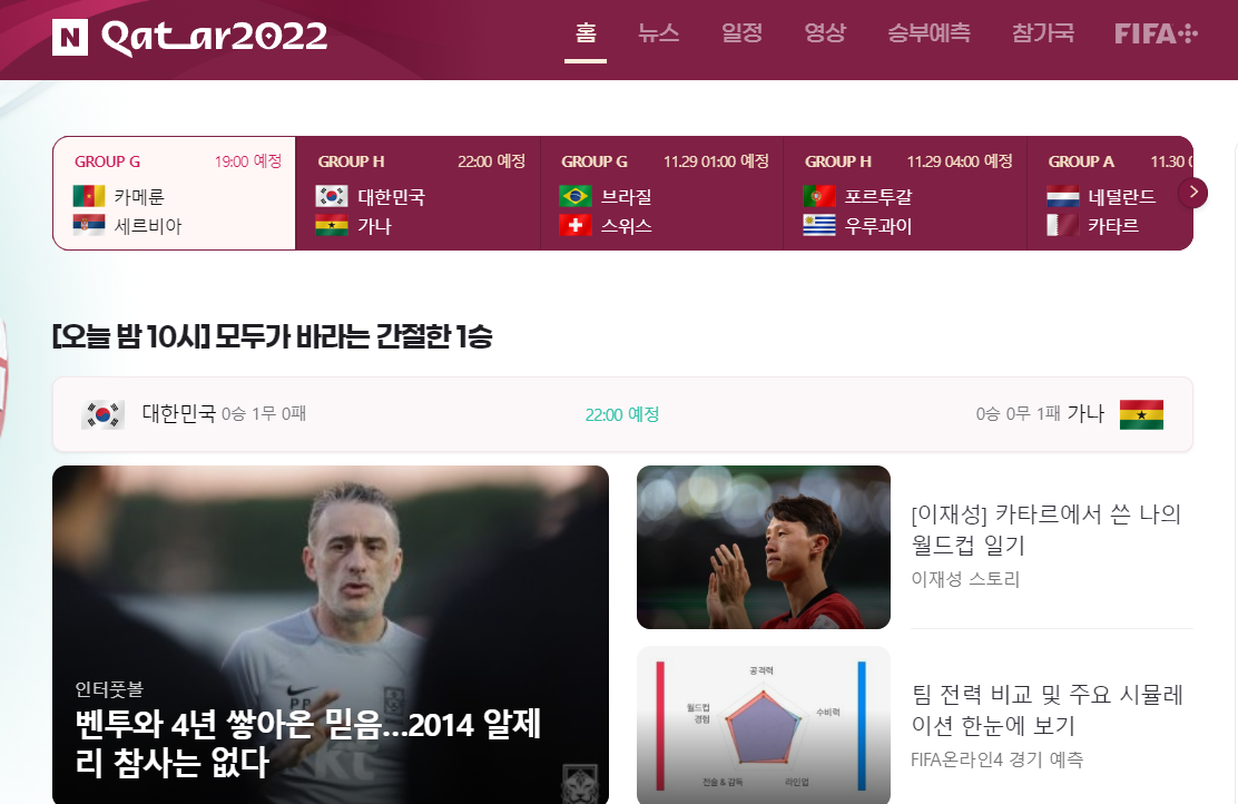 네이버 스포츠에서도 월드컵 실시간 중계를 볼 수 있습니다. 이번 월드컵의 많은 정보들도 확인 가능하니 관심있는 팀에대한 뉴스도 알아보세요.