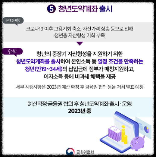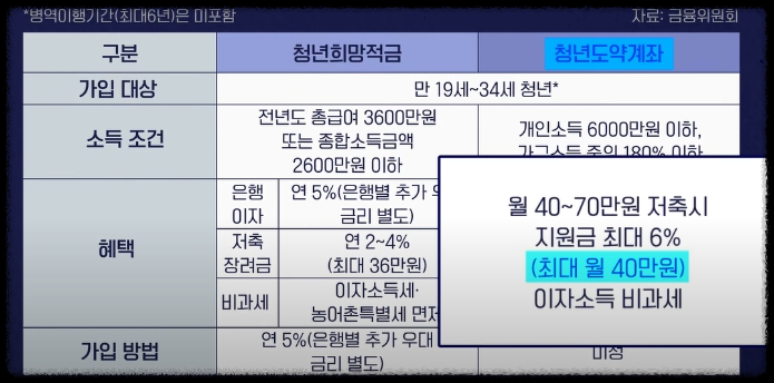 - 청년도약계좌: 매월 70 만원 한도 내에서 납입 5년 만기, 저축 장려금 최대 6% 지원, 비과세