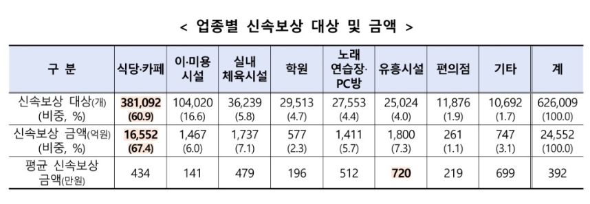 신속 보상을 가장 많이 받는 업체로는 식당, 카페가 38만 1,092 곳으로 가장 많으며, 그 외 이. 미용업 및 실내 체육시설이 있습니다.