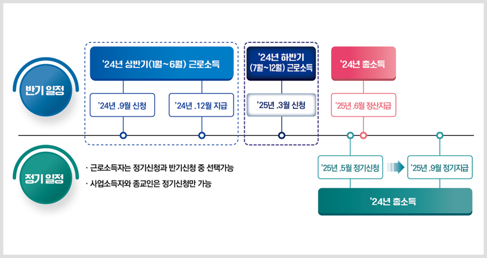 - 5월 1일~6월 2일에 진행되는 정기 신청을 해야 합니다. 반기신청은 근로소득 만 가능