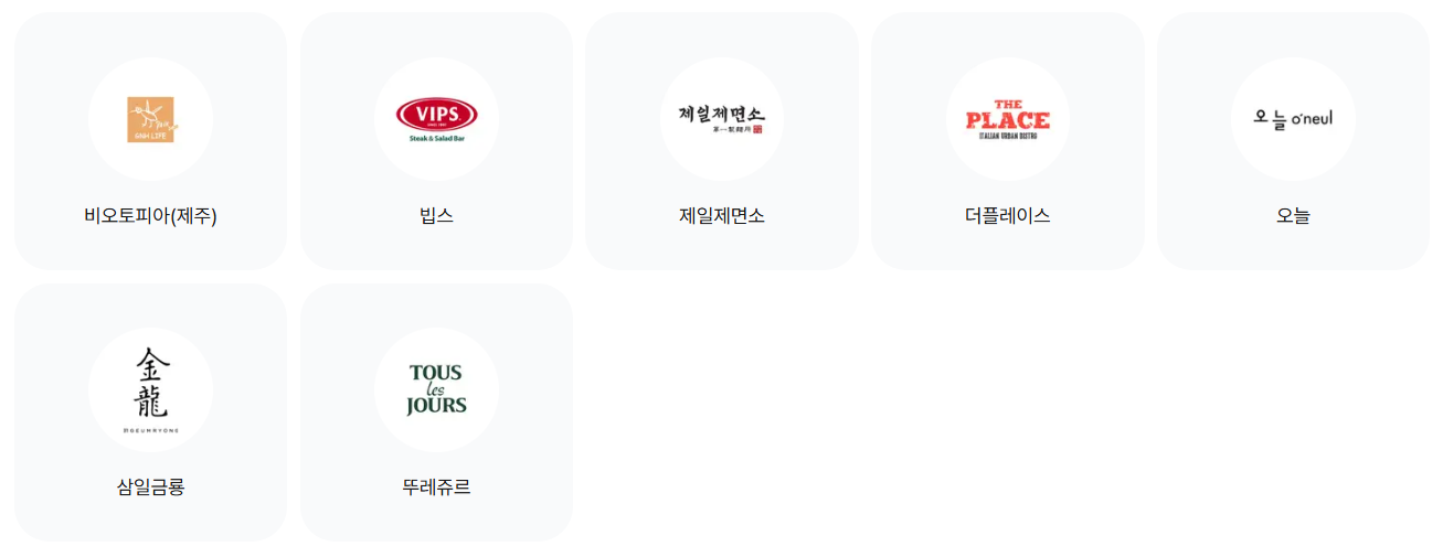 - 비오토피아(제주), 빕스, 제일제면소, 더플레이스, 오늘, 삼일금룡, 뚜레쥬르 등