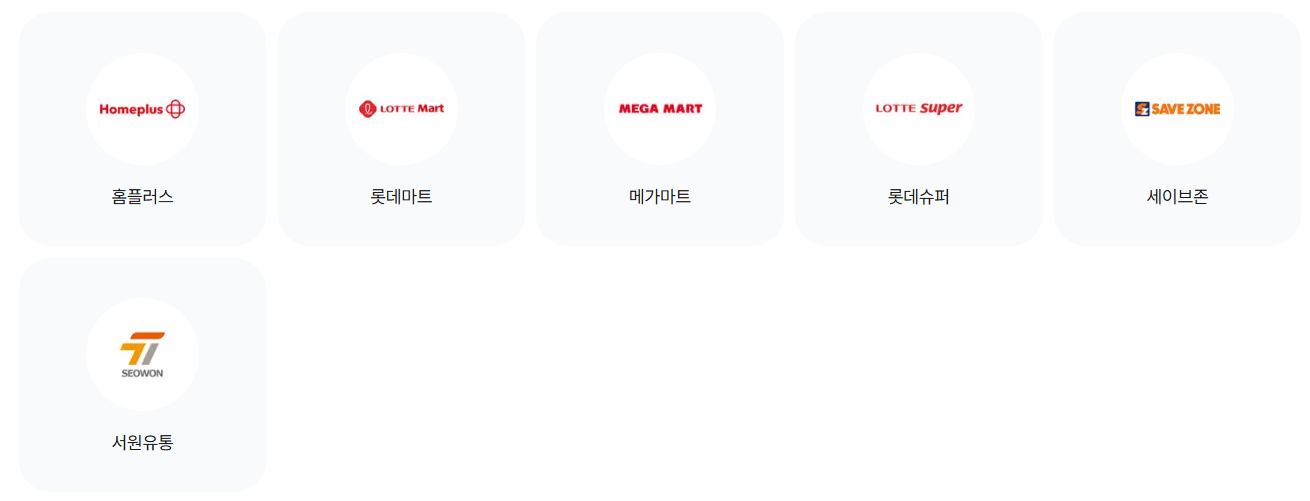 홈플러스, 롯데마트, 메가마트, 롯데슈퍼, 세이브존, 서원유통에서 사용 가능합니다. 이마트에서는 사용이 불가하니 헷갈리지 마세요.