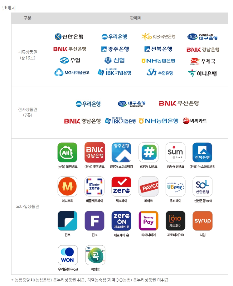 지류상품권 판매는 총 16곳, 카드형 전자상품권 판매는 7곳, 모바일 상품권은 20 곳입니다.