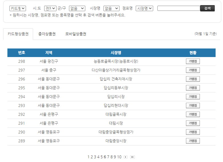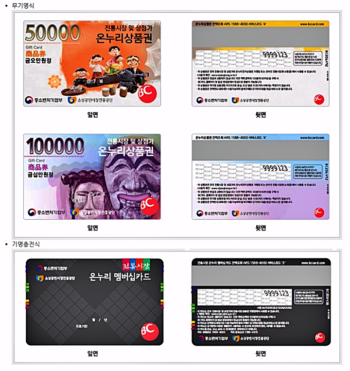 오프라인 전통시장뿐만 아니라 온라인 전통시장 쇼핑몰에서도 사용 가능한 카드형 상품권입니다. 온라인에서도 사용 가능한 마켓은 아래에 있으니 참고하세요.
